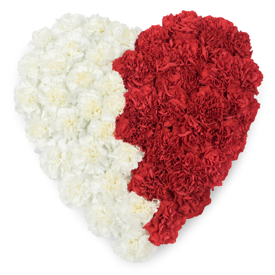 Celebrate love and sympathy with our Timeless Carnation Heart arrangement from Handy Flowers. This beautifully unique bouquet features lush white and striking red carnations, expertly arranged to form a captivating heart shape.